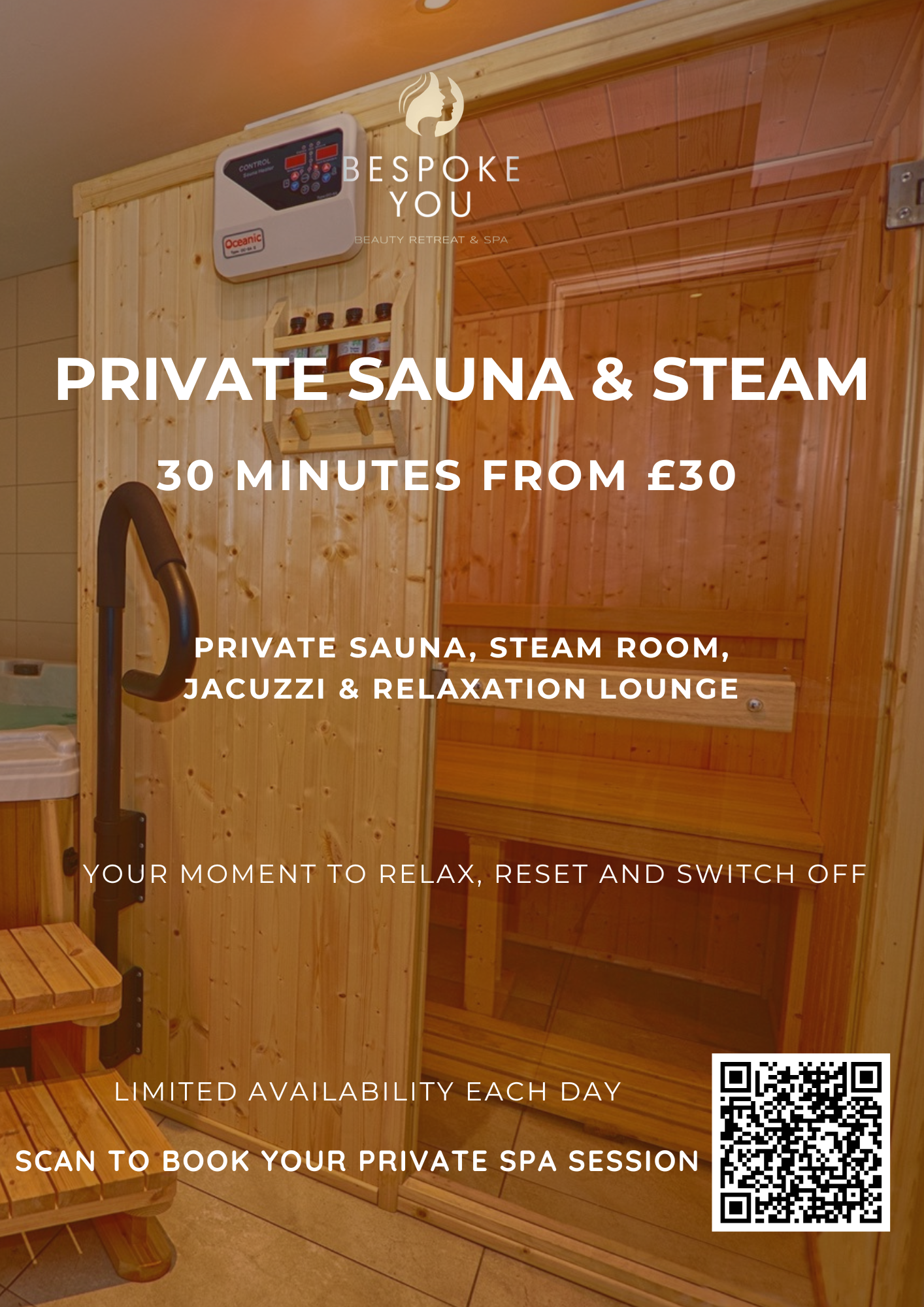 Escape the pace of everyday life and discover our newly curated spa menu at Bespoke You. Our private spa experience invites you to unwind in complete tranquillity, with exclusive access to our sauna, steam room, jacuzzi and relaxation lounge. Whether you’re looking for a quick reset or a longer indulgent escape, each visit is designed to calm the mind, ease tension and restore your natural glow. Perfect as a standalone experience or paired with one of our relaxing treatments, our spa rituals offer the ultimate balance of results and relaxation, your moment to truly switch off.